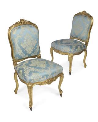 in the Louis XV manner, the cartouche shaped backs with festooned cabochon crestings above similarly carved serpentine seat rails, on husk carved scrolling cabriole legs with later castors, each upholstered in pale blue and ivory silk damask (2)