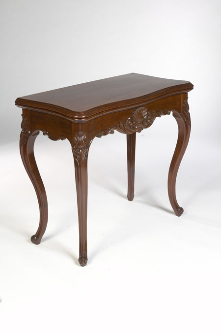 the serpentine top with moulded edge and baize skiver above a scroll carved frieze centred by a scallop shell, on leaf carved cabriole legs, the sliding rear legs enclosing fitted racks for playing cards