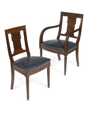 in the Empire taste, possibly Dublin, the moulded bar backs with plain panel splats draped with carved swags above bowed and close nailed blue hide stuffover seats on fluted tapering legs, including two armchairs with downswept acanthus carved terminals (16)