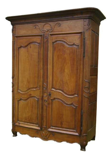 the projecting cornice above foliate scroll carved frieze and a pair of rococo panelled long doors and panelled sides between moulded uprights, on scroll carved feet