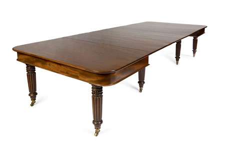 the rounded rectangular top with four additional leaves above a plain frieze with moulded lip, on eight boldly turned and reeded tapering legs ending in brass socket castors