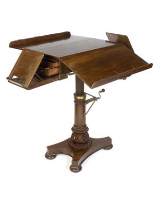 the hinged rectangular drop leaf top, fitted at each end with brass page stays, on ratchet supports, assisted by a central sash and counter weight action, each corner with brass ferrules possibly intended for candle sconces (not present), the frieze at each end containing a slide above two graduated short drawers,one enclosing stationery fittings and a pair of smaller pull out slopes on ratchet supports, the whole with a rise-and-fall mechanism on a hand-cranked brass winding screw, the turned column carved with stiff acanthus above a gadrooned collar, on a quadrapartite platform base with bun feet and recessed castors