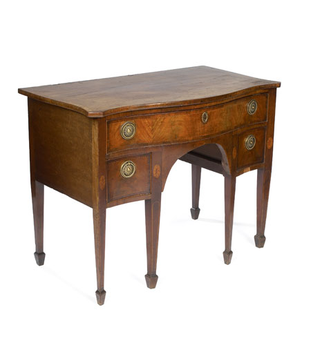 of serpentine form, the full length frieze drawer enclosing a leathered slide revealing a well-appointed fitted interior with lidded compartments and central mirror on a ratchet support, the arched apron flanked by two short drawers with foliate brass ring handles and inlaid paterae on tapering legs with off-set spade feet