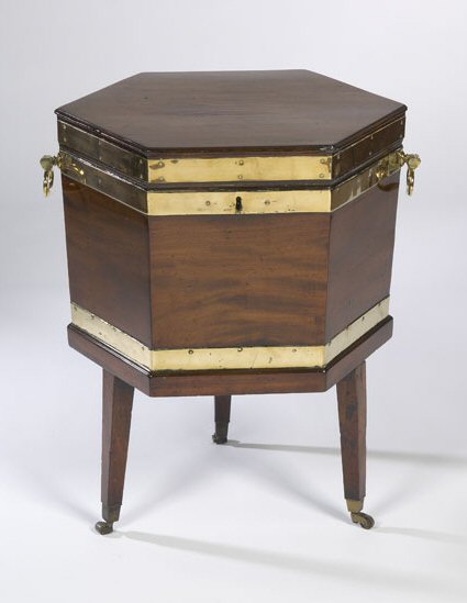 the hexagonal hinged lid enclosing a later fitted interior, above tapering sides and raised on square legs and brass box castors