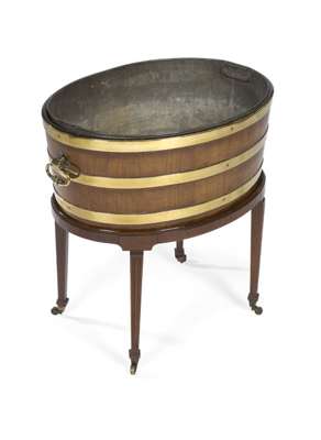 of oval section, with brass drop handles, on stand with fluted tapering legs ending in brass castors, detachable zinc liner