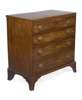 of small proportions, the line inlaid top with a brushing slide above four graduated and crossbanded drawers with patera-stamped oval brass handles, on French style splayed bracket feet