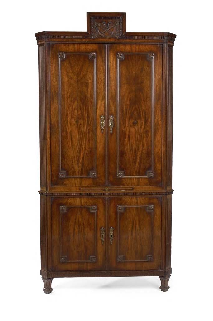 the upper section with moulded dentil cornice and central entablature carved with flaming torch and quiver trophies above twin panelled doors with rosette angles, enclosing shaped and fitted shelves enclosed by fluted pilasters, the corresponding base with fluted apron on square fluted legs