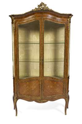 of serpentine outline, the arched cornice with rococo cresting and female mask capitals above a pair of glazed doors and glazed sides enclosing a watered silk lined interior with glass shelves, the lower part decorated with panels of foliage, on cabriole legs, the whole with trailing foliate gilt metal mounts and sabots