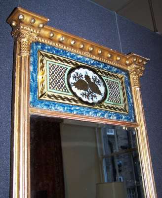 the projecting ball applied cornice above a verre eglomise frieze decorated with shells and a bevelled plate between fluted corinthian uprights