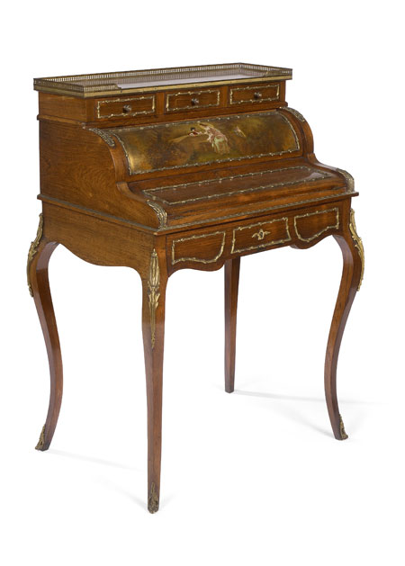 the top with gilt metal gallery above shaped fall enclosing fitted interior with sliding well on cabriole legs ending in gilt metal sabots
