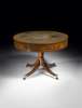 the tooled skiver above four cockbeaded drawers divided by four out-swinging triangular lined drawers, with brass ring handles (associated), on a 'beehive' turned column and reeded downswept quadruped base with brass box castors
