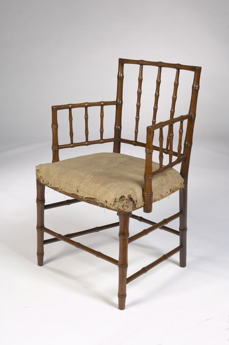 the lattice back above outset arms and stuffover seat on faux bamboo turned legs united by stretchers