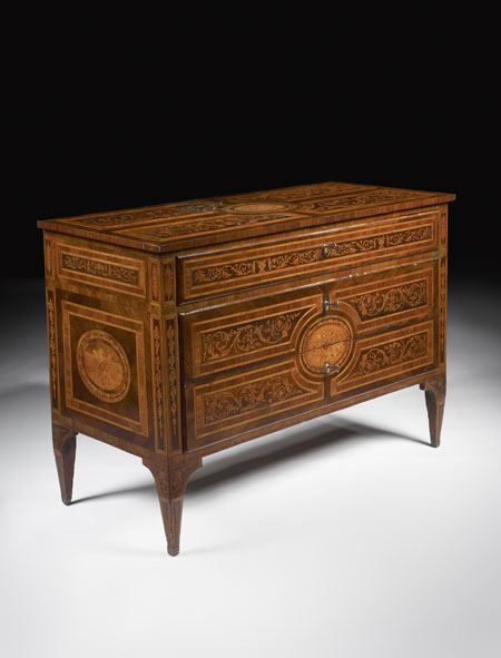A North Italian walnut, rosewood, amaranth and tulipwood crossbanded neo-Classical commode, circa 1800 in the manner of Giuseppe Maggiolin