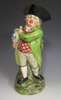 depicting a standing man, holding a Delft style jug of ale in his hand, wearing a black hat and green coat, standing on a naturalistic base, impressed mark