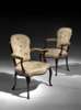 the cartouche shaped backs above outscrolling padded arms with scroll carved terminals and supports, the serpentine stuffover seats on slender leaf carved cabriole legs, each with later petit point upholstery (2)