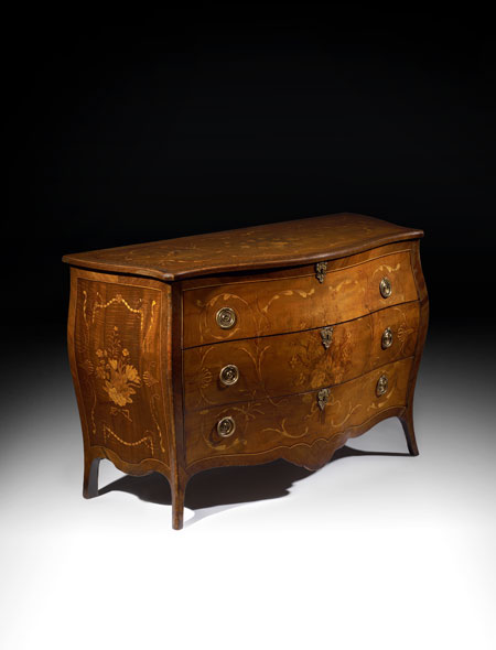 The quality of this commode suggests that it was made in the London workshops of a skilled immigrant cabinet maker of the 1770's; a possible attribution being Pierre Langlois, with inlay work by Zurn. Note the 'transitional' nature of the decoration, from foliate marquetry to neo-Classical inlay, as well as the 'transitional' methods of construction, involving a French cabinet maker adapting to the demands of wealthy London clients. The mahogany drawer linings with the fronts veneered onto horizontally laid blocks follow established English techniques, while the lack of dust boards and overhanging drawer fronts are echoes of the maker's continental origins. The florid and finely cut inlay work married with expensive drawer linings in a pure commode form are an example of the immense impact that French design and craftsmanship had on the development of English furniture.