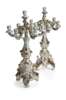 each with detachable top having five flower encrusted arms and leaf form sconces, above rococo scrolled and flower encrusted column and three scroll feet, each surmounted by a cherub holding fruit or flowers, underglaze blue crossed swords mark (restorations) (2)