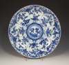 blue painted with fan shaped panels containing flowers and with a central circular floral painted panel
