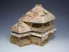 of interlocking diamond form, in two sections, the roof decorated with birds, vine leaves and grapes, above an open balconied area, lower roof and lower floor with open area, windows, and door hung with rope curtain