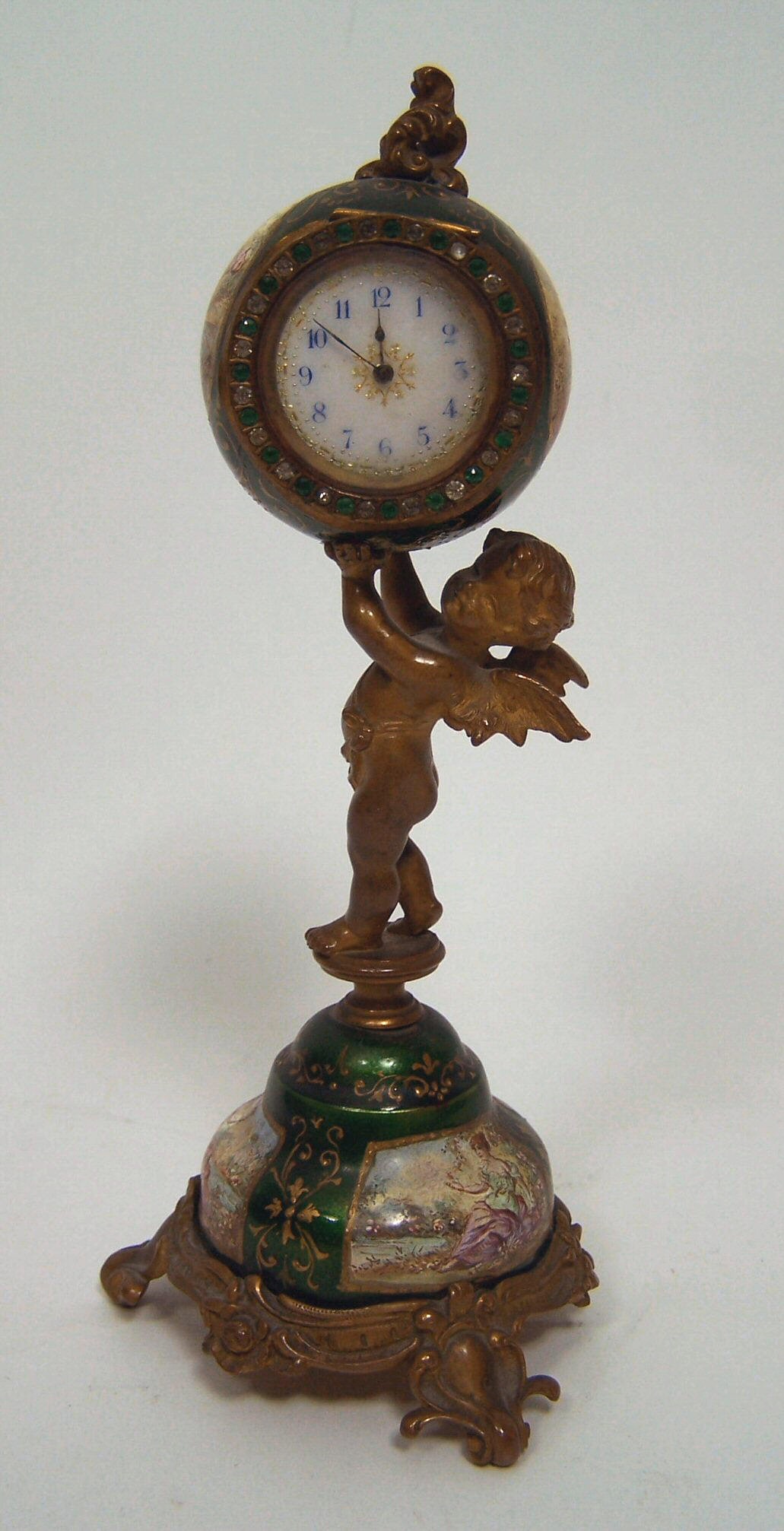 the watch on a ball with enamel decoration, jewelled bezel, an enamel and gilt dial held aloft by a gilt Putto, on domed circular base with gilt metal scroll base
