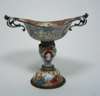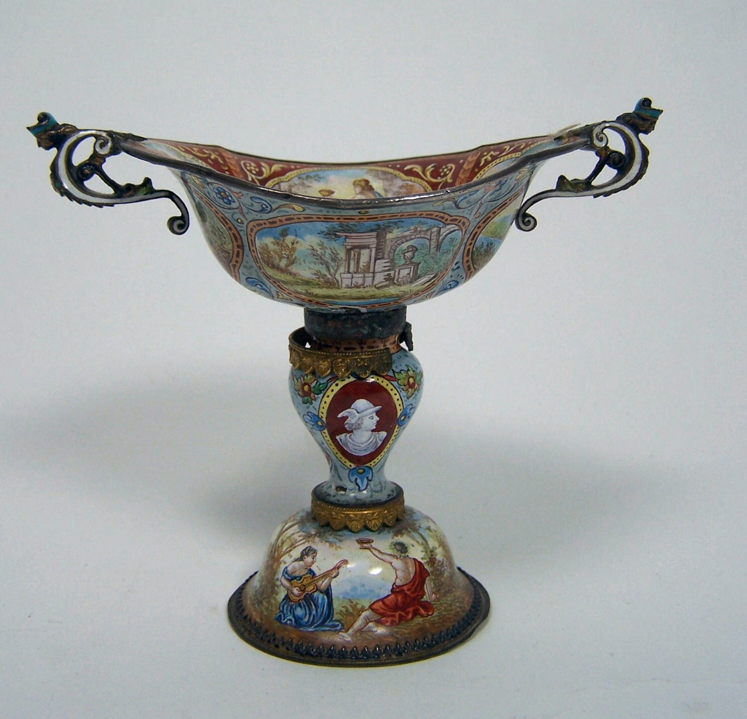 the oval bowl with red ground and vignettes of figures in landscapes, the exterior with a pale blue ground with trailing floral design and vignettes of classical buildings with silver gilt engraved rim and scrolling handles with enamel detail [damages to gilt metal collars]