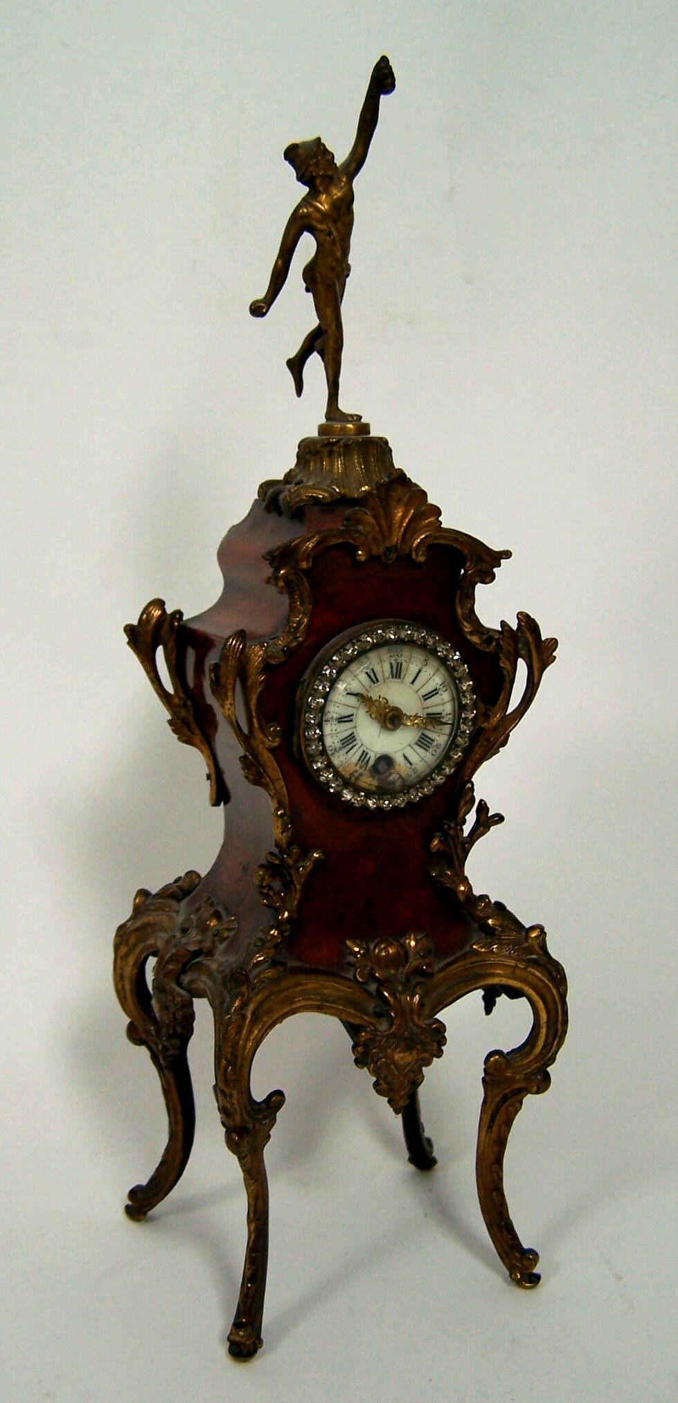 of Louis XV style, the single train movement with circular enamel dial and paste bezel, enclosed by scrolling rococo case raised on cabriole legs