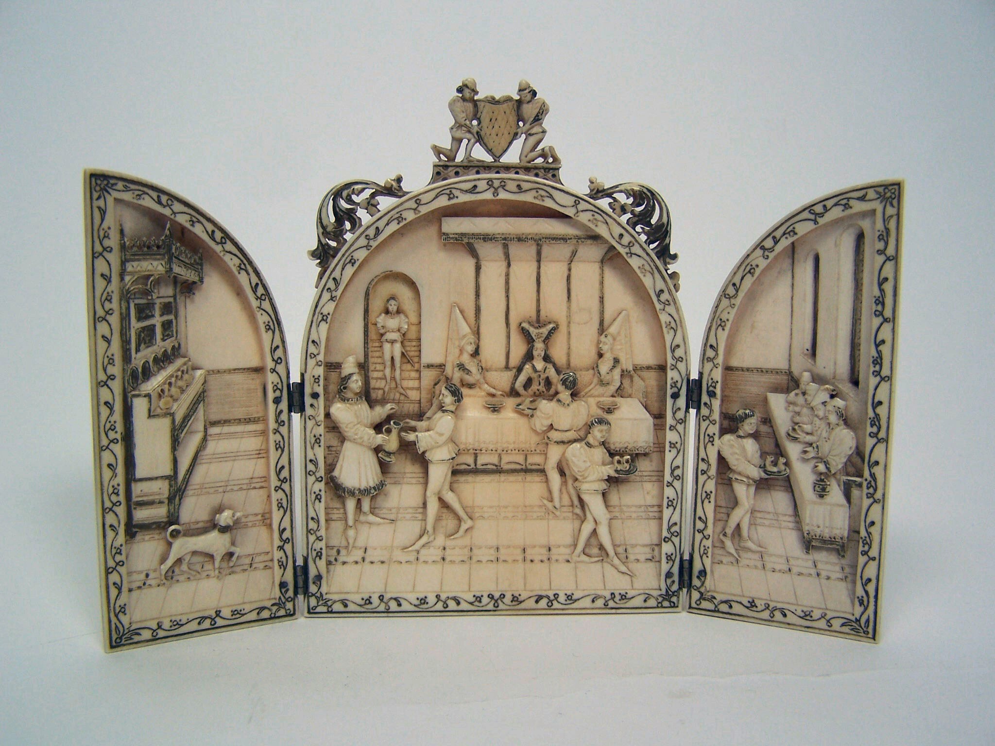the central arched panel with a surmount of a shield with two figural supports, lower leaf scrolls, the main section depicting a feast, the figures in Elizabethan costume