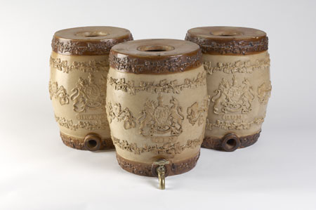 decorated with bands of moulded vine leaves and the Royal coat of arms, named 'brandy', 'rum' and 'gin', one with tap, impressed mark Doulton and Watts, London (3)