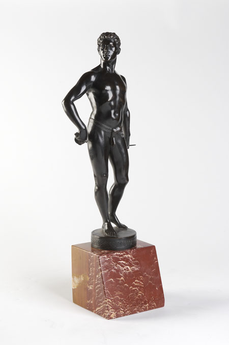 wearing a belt and holding his epee behind his back, gazing to dexter, on circular plinth base incised with guilloche and signature, on a red and brown veined marble plinth, sloping to the front