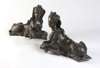 each with decorative headresses and tasselled drapes, on underscrolled plinth bases, dark green patination (2)