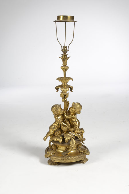the foliate cast nozzle on a column of leaf fonds clasped by a pair of cavorting cherubs on a surbase of openwork 'rocaille' and a foliate cast circular cavetto plinths, on leaf scoll feet, fitted for electricity and a shade