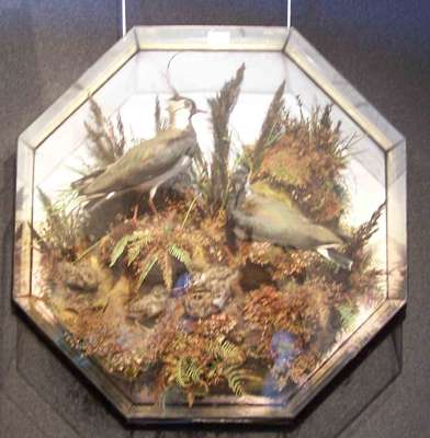 depicting a male and female plover and their young below, with worm prey, within a naturalistic rocky shrubland setting and an ebonised and giltwood framed octagonal display case, glazed 'in the round'