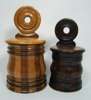 baluster shaped and of banded staved construction, with hinged cover, 28.5cm high; and a similar stained wood example, 24.5cm high (2)