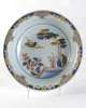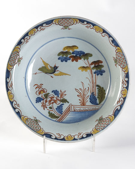 decorated wtih scrolling foliage to the rim, the well decorated with chinoiserie scene with a fence, bold flowers and foliage and an exotic bird in flight