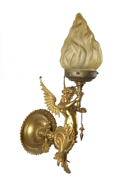 each cast with twin scrolling branches supported by a mythical winged and crowned herm figure on a scrolled 'fish-tail' support and foliate engraved ring wall mount, with moulded flame-glass shades (12)