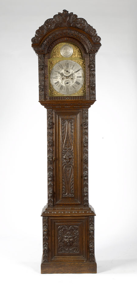 the twin train movement with anchor escapement, the leaf scroll pediment centred by a cockerel above arched dentil frieze and a brass and silvered dial with rococo spandrels, subsidiary seconds and calendar dial, inscribed 'Tempus fugit' to the arch, the lion mask carved trunk door between fruting vine pilasters and leaf scroll carved sides, the similarly decorated panelled apron on plinth base