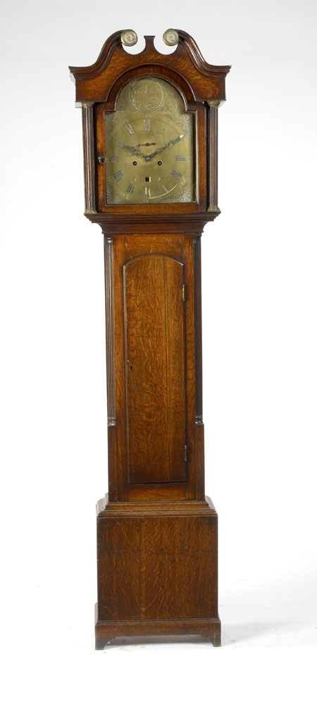 the twin train movement with anchor escapement, the swan neck pediment with brass roundels above a shell and 'dolphin' arabesque scroll engraved brass dial with Roman chapters, subsidiary seconds dial and calendar aperture, signed 'Geo Scot Canongate' to the arch, the arched trunk door between reeded quadrant corners, on plain apron and bracket feet