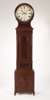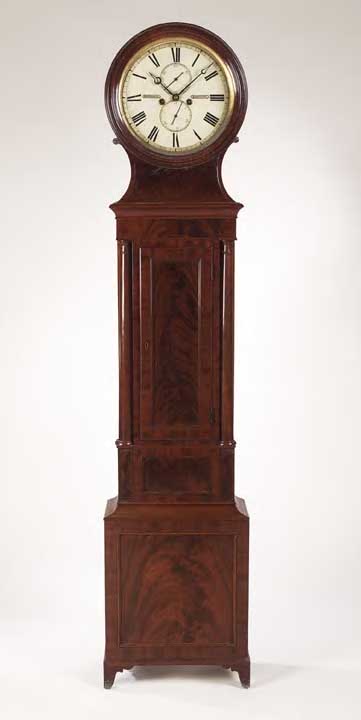 the twin train movement with anchor escapement, the circular painted dial with subsidiary seconds and date dial, the drum hood above panelled trunk door flanked by turned columns above a panelled base on bracket feet