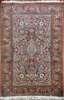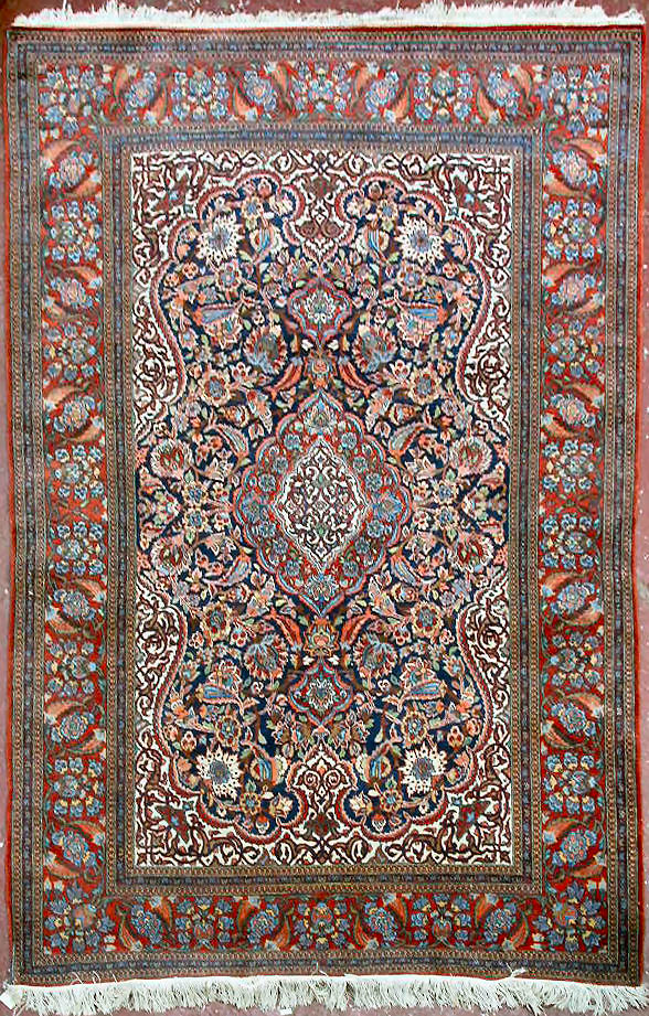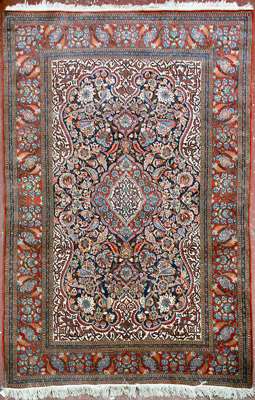 the indigo field with central red and ivory medallion suspending pendants, ivory spandrels, within red scrolling foliate border between bands
