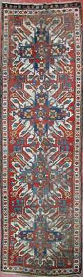 the red field with four ivory sunburst lozenge and indigo cruciform motif medallions, within ivory star and vine border (worn)