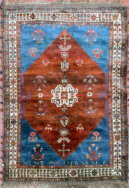 the plain brown field with central ivory medallion, plain indigo spandrels with inscription to each end, within ivory flowerhead and floral vine border between red and green bands