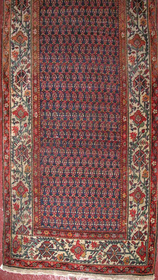 the indigo field with allover boteh pattern, within ivory rosette, palmette and angular vine border between red bands