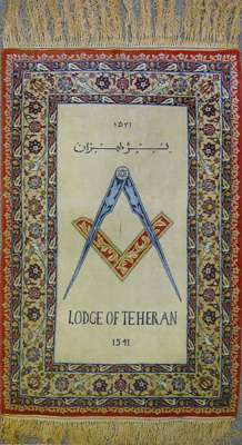 the plain cream field woven with central masonic devices and inscribed 'Lodge of Teheran 1451', in Persian above and English below, within cream palmette, bird and vine border between indigo bands
