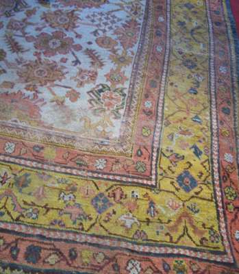 the ivory field with madder rosettes and palmettes linked by vines, within a main saffron border of angular foliate sprays, between pink bands