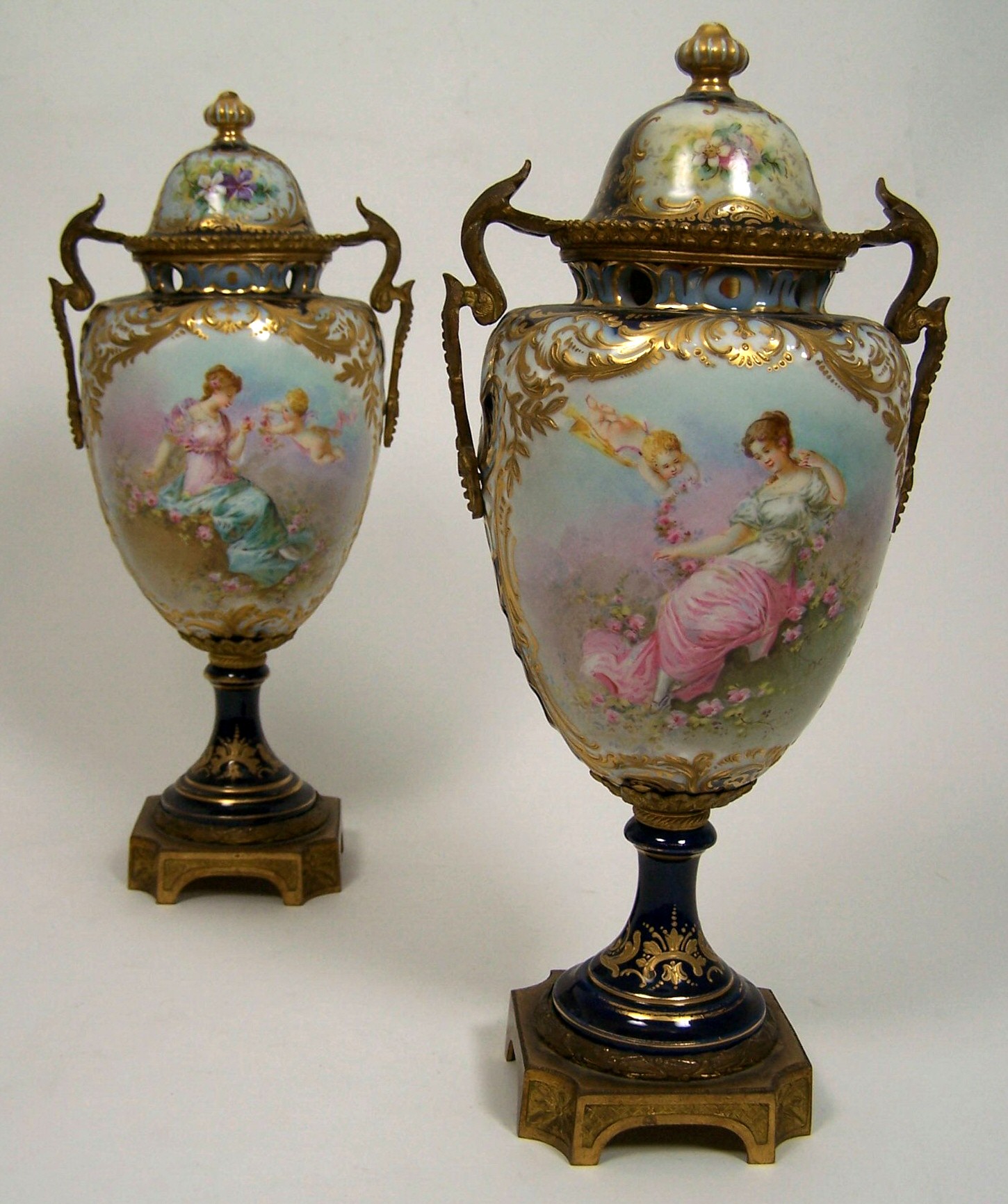 of baluster form, with giltmetal mounts and handles, each painted with opposed cartouche panels, depicting a lady with a cherub to one side, signed Delys, and a bouquet of summer flowers to the other, framed by gilt scrolling foliage on a dark blue ground (2)