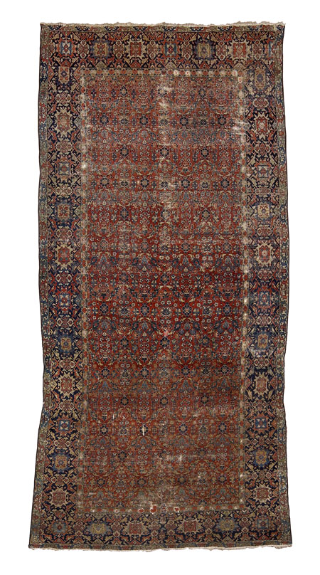 mid 19th century, the red field with allover herati pattern, within indigo angular rosette and arabesque pattern between ochre and cream bands