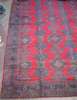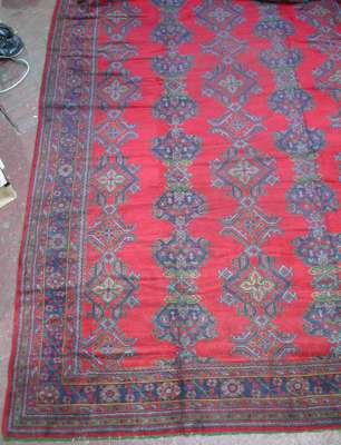 the red field with allover pattern of indigo palmettes and cruciform motif columns, within indigo rosette and floral vine diagonal border between bands
