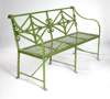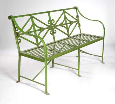the rectangular back with two reeded lozenge trellis splats with bifurcated outscrolling terminals above a metal slatted seat, on flattened legs with pad feet, united by round wire stretchers