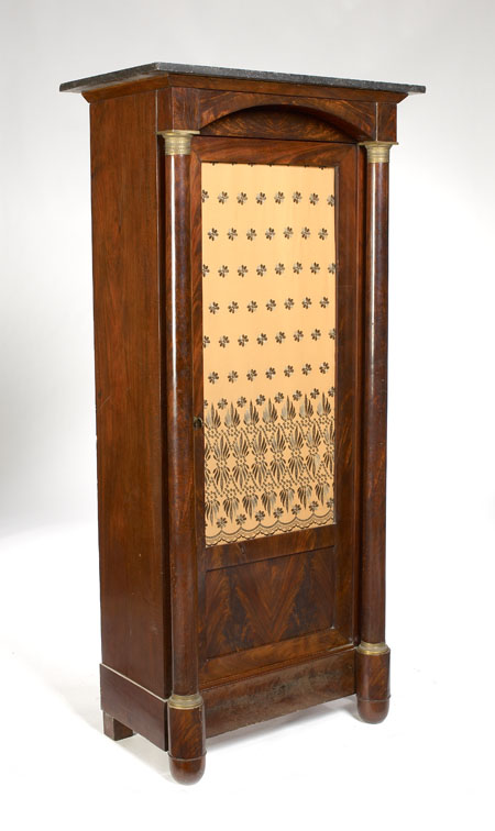 the rectangular marble top above a single full length door, enclosing slots for adjustable shelves, below an arched frieze between turned columns headed by engine turned capitals decorated with anthemia on bun feet