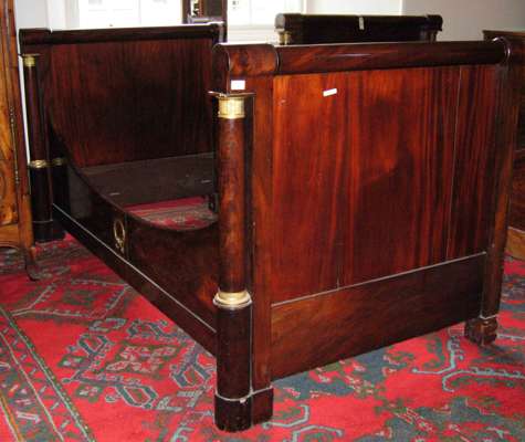 the rectangular panelled ends with rolled top rails on turned front columns and square section rear supports, with lotus-cast engine turned capitals and collars at each apron, with shaped wooden front rail, on recessed castors